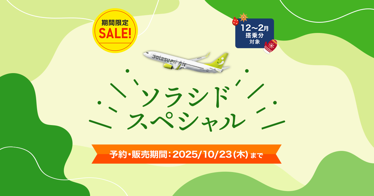 スポンサーリンク ソラシドスペシャル 6月から10月搭乗分発売開始! 国内旅行 2025.05.162025.06.02 ソラシドスペシャル始まりましたね。 対象搭乗期間:2025年6月5日(木)~10月25日(土)予約販売期間:2025年5月16日(金)0:00~5月22日(木)23:59※2025年8月8日(金)~8月18日(月)ご搭乗分の設定はなし支払い期限は予約日当日中です。沖縄、九州方面(羽田-福岡間の運行はなし)へお安く行くことができます。サービス感なども他の航空会社と変わらないです。予定が決まっていれば絶対にお得です! ソラシドスペシャルのご案内期間限定セール!ソラシドスペシャルは販売期間限定のおトクな運賃です。ソラシドエアは九州・沖縄を中心に東京(羽田)、宮崎、熊本、長崎、鹿児島、大分、福岡、神戸、名古屋(中部)、沖縄(那覇)、石垣の11都市に就航中。